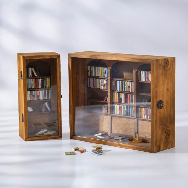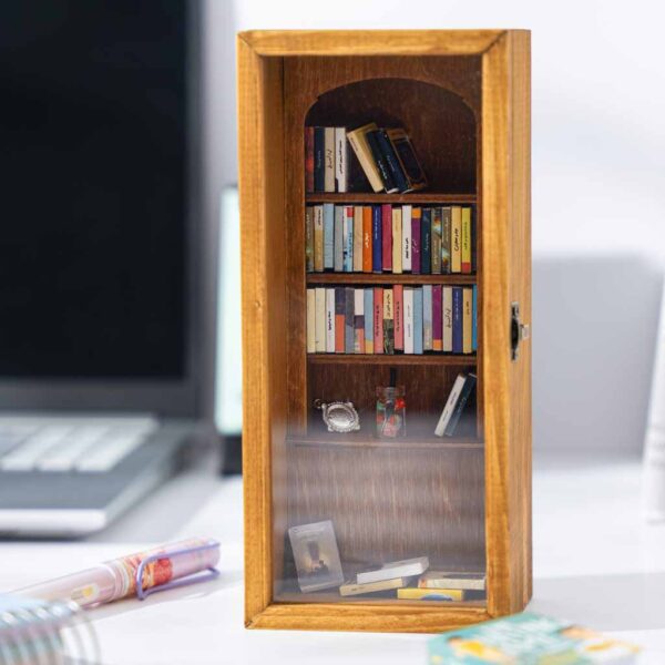 این کتابخانهی ظریف و هنری یک همراه دوستداشتنی برای علاقهمندان به کتاب و زیباییهای مینیاتوری است. درون قاب چوبی کلاسیک آن، مجموعهای از جزئیات کوچک اما دلنشین قرار گرفته که هم بهعنوان یک دکور منحصربهفرد و هم بهعنوان یک ابزار کاهش استرس کاربرد دارد.